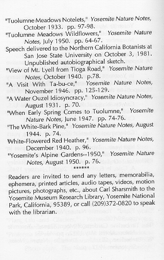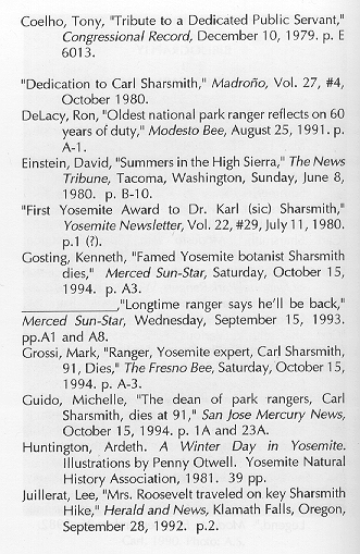 Sharsmith, John and Shields, Allan, 1996, Climb Every Mountain: A Portrait of Carl Sharsmith. Jerseydale Ranch Press: Mariposa, CA. Written by Carl Sharsmith's son and a fellow Tuolumne Meadows naturalist. Includes testimonials by admirers at memorial service following Carl's death.
