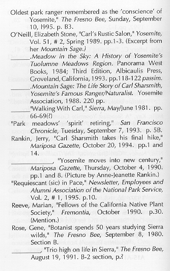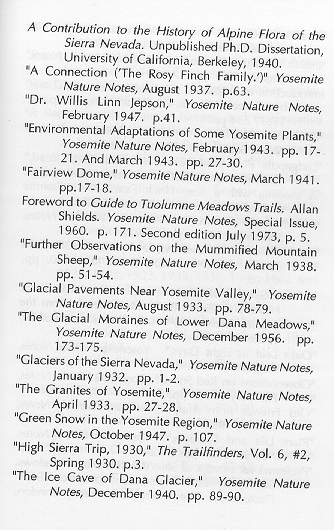 Pages below are from Sharsmith, John and Shields, Allan, 1996, Climb Every Mountain: A Portrait of Carl Sharsmith. Jerseydale Ranch Press: Mariposa, CA. Pages xiv-xxiv. Permission to reproduce this bibliography on the website name4carl.org received from Allan Shields, 4/20/06.