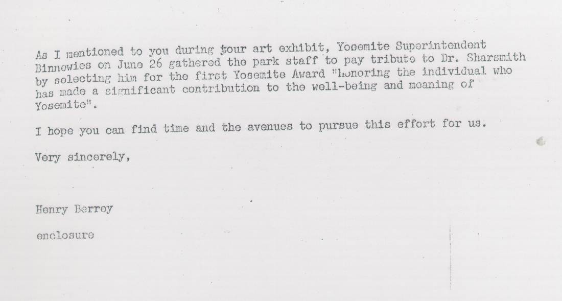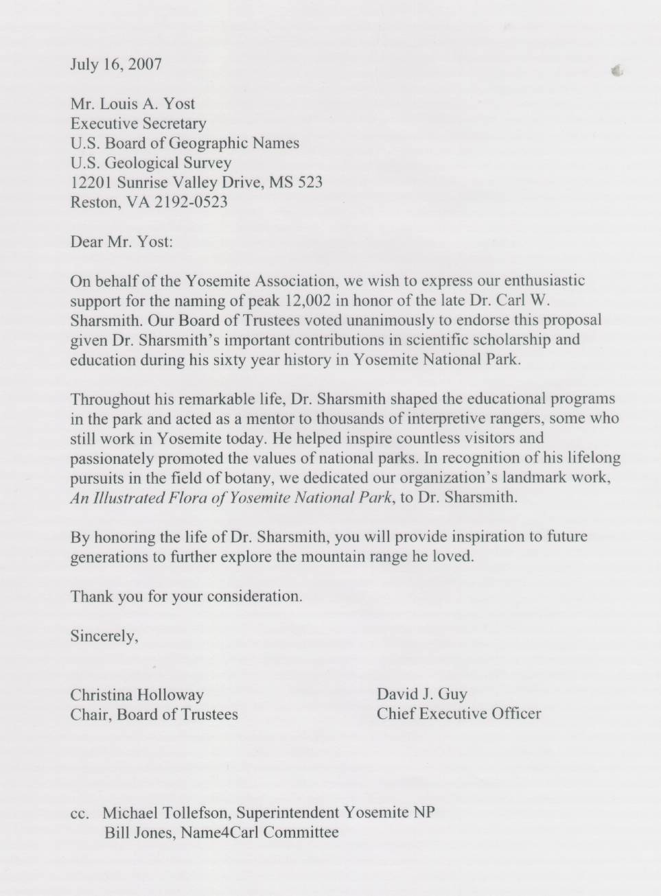 ACTION OF BOARD AT MEETING OF SEPTEMBER 9, 2006: At its annual meeting the Board of Directors of the Yosemite Association endorsed the Sharsmith Peak naming proposal, as confirmed by President Steve Medley. Mr. Medley died not long after, however, and thus a delay occurred until the following letter was prepared.