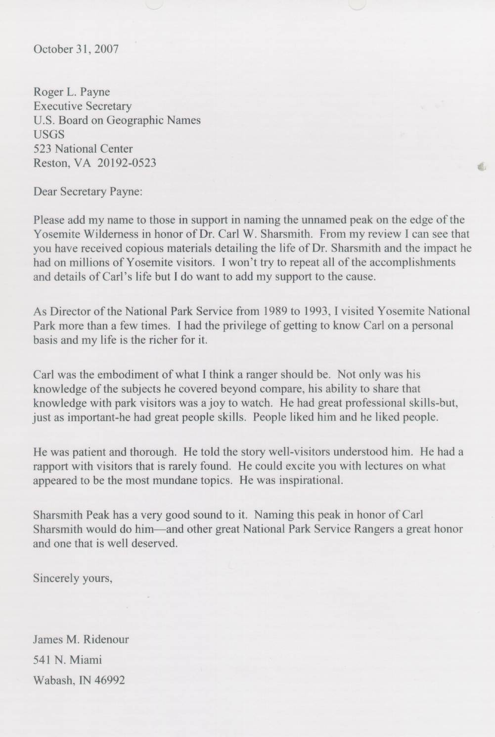 103) JAMES RIDENOUR. Wabash, Indiana. Director, National Park Service 1989-1993; Director Indiana Department of Natural Resources, 1981-1989