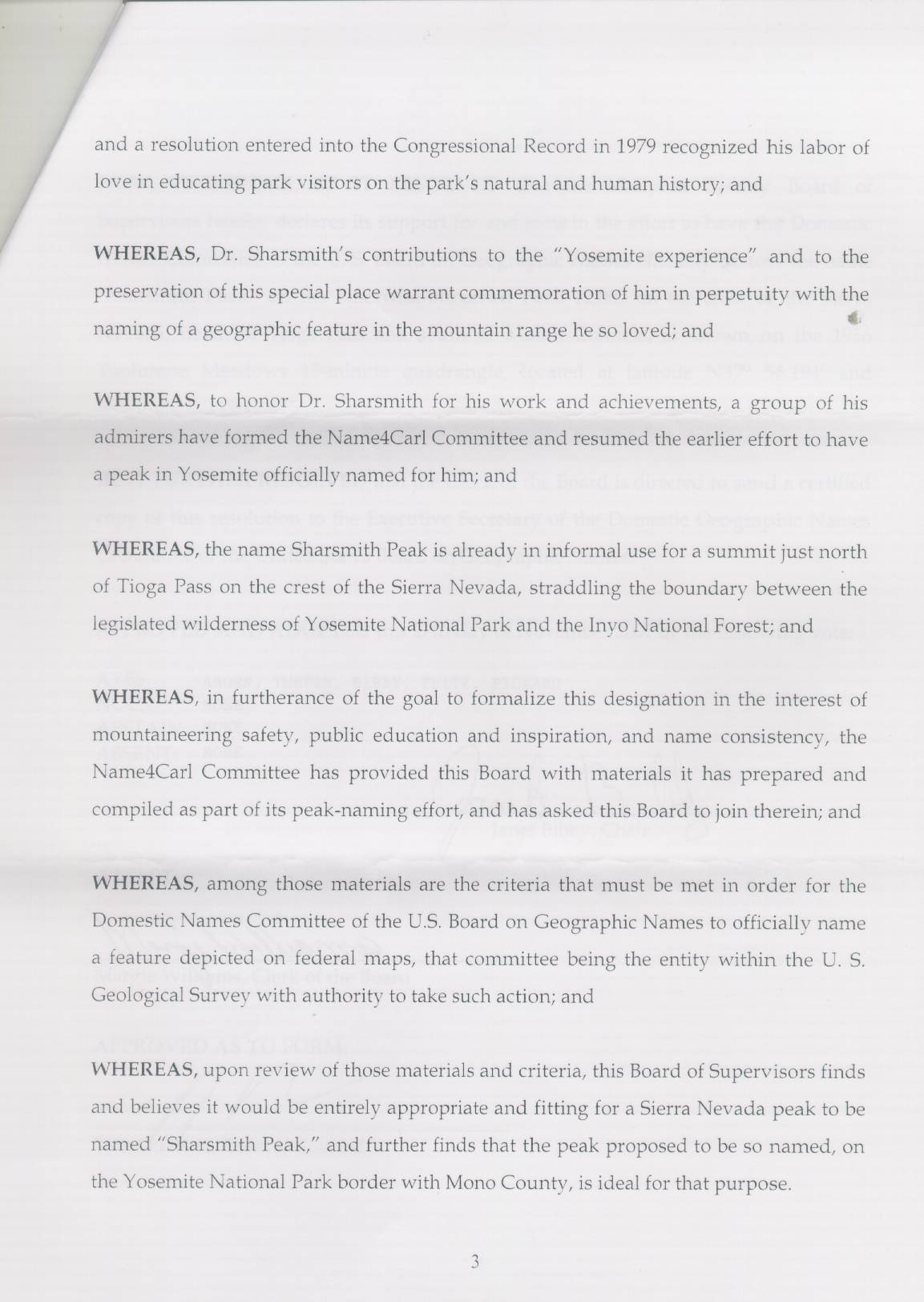 Resolution 07-548 dated November 27, 2007 endorsing official naming of Sharsmith Peak by the U.S. Board on Geographic Names.