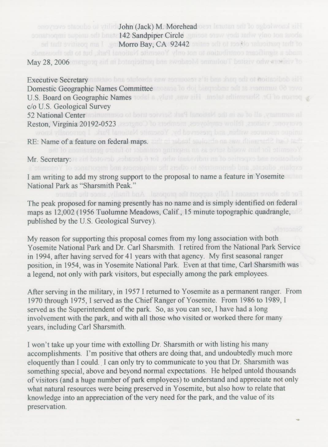 Jack Morehad. Jack is a former Superintendent of Yosemite National Park and has also been superintendent of Isle Royale (Michigan) and Everglades (Florida) National Parks and served as a ranger in Grand Teton (Wyoming) National Park. Retired. Based in Morro Bay, California.