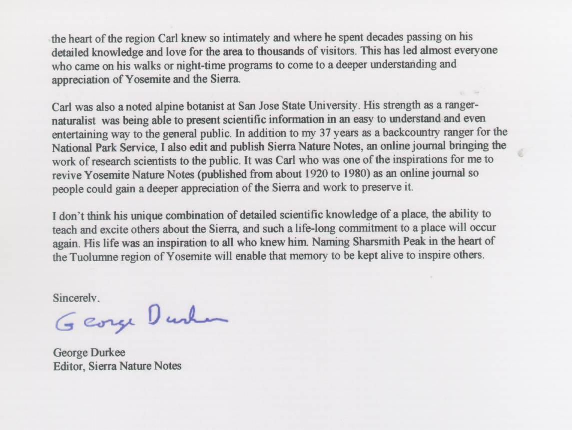 Home & Synopsis/Status Reports Purpose & Method Who was Carl Sharsmith? Why name a Yosemite feature for Carl?/Origin of Proposal Which feature should be named for Carl? How can a feature be named for Carl? SUMMARY OF SUPPORTING STATEMENTS Contacts/Resources Webmaster Search Form