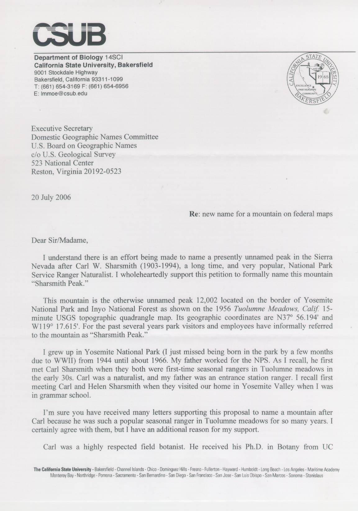 Home & Synopsis/Status Reports Purpose & Method Who was Carl Sharsmith? Why name a Yosemite feature for Carl?/Origin of Proposal Which feature should be named for Carl? How can a feature be named for Carl? SUMMARY OF SUPPORTING STATEMENTS Contacts/Resources Webmaster Search Form
