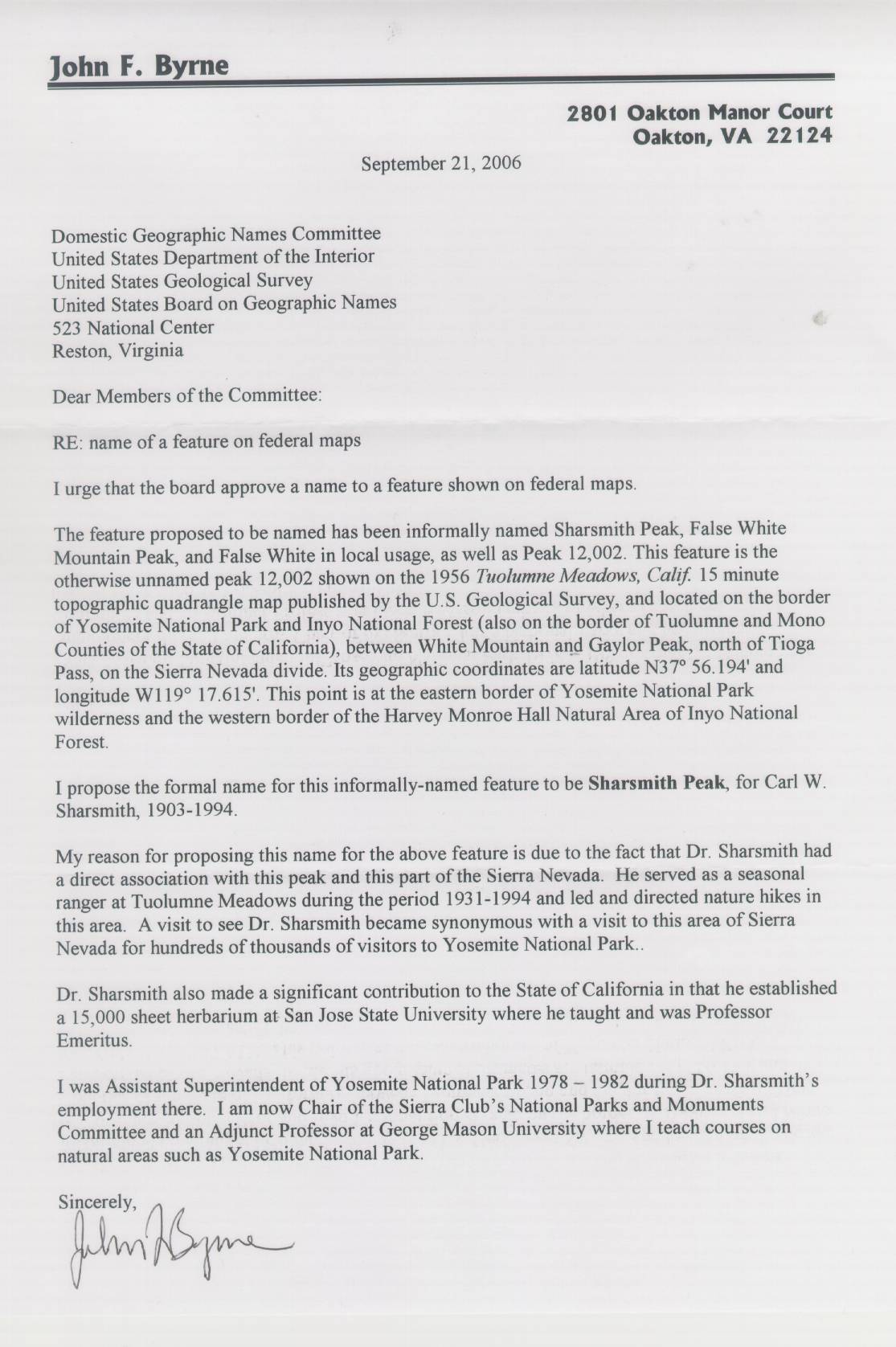 John Byrne. Former Yosemite National Park Assistant Superintendent, 1978-1982. Now Chair of Sierra Club National Parks and Monuments Committee and Adjunct Professor at George Mason University. Based in Oakton, Virginia.