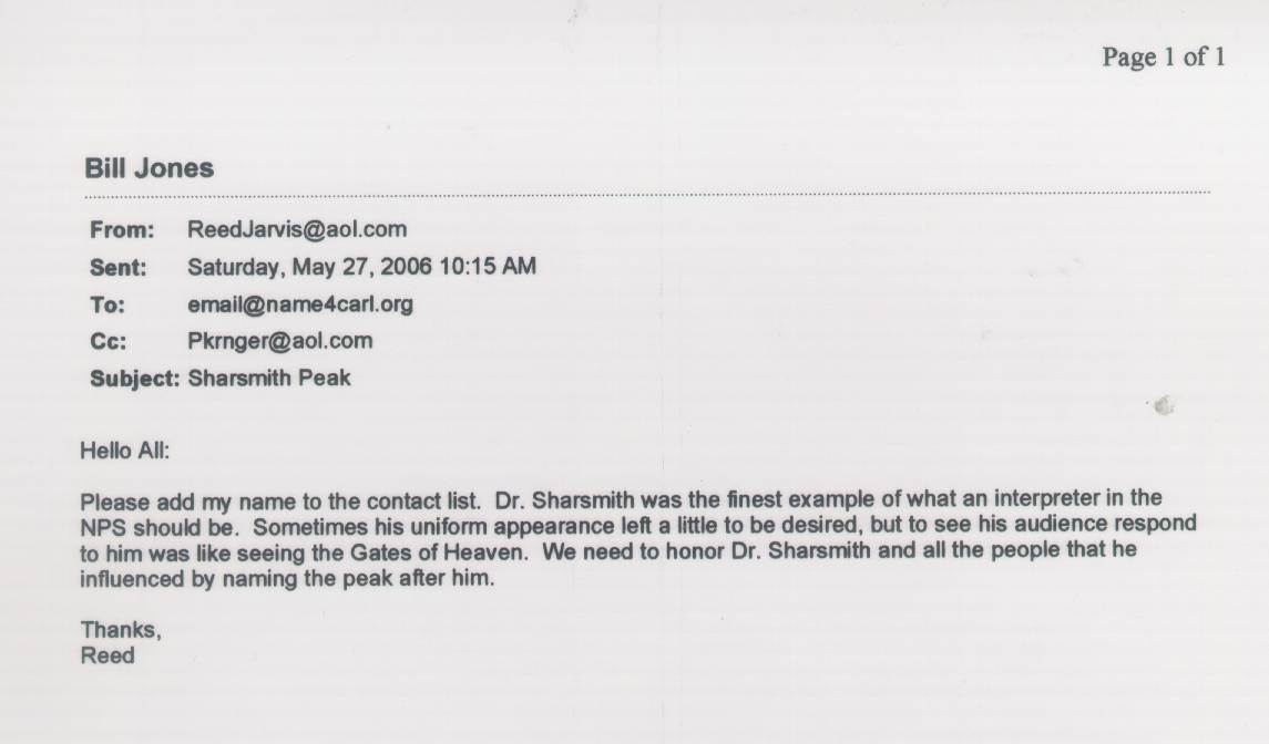 Home & Synopsis/Status Reports Purpose & Method Who was Carl Sharsmith? Why name a Yosemite feature for Carl?/Origin of Proposal Which feature should be named for Carl? How can a feature be named for Carl? SUMMARY OF SUPPORTING STATEMENTS Contacts/Resources Webmaster Search Form