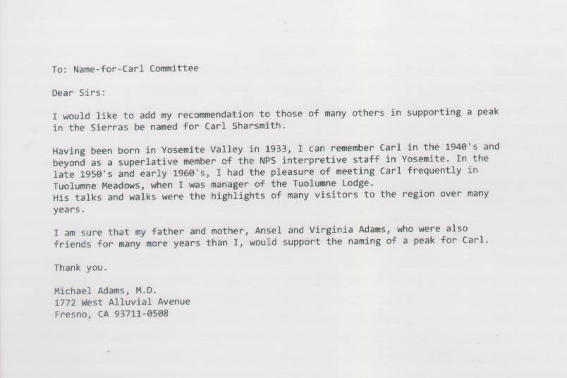 Home & Synopsis/Status Reports Purpose & Method Who was Carl Sharsmith? Why name a Yosemite feature for Carl?/Origin of Proposal Which feature should be named for Carl? How can a feature be named for Carl? SUMMARY OF SUPPORTING STATEMENTS Contacts/Resources Webmaster Search Form