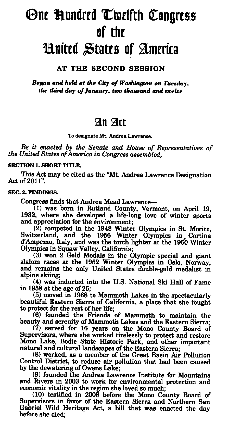 S. 925 THE MOUNT ANDREA LAWRENCE DESIGNATION ACT OF 2011