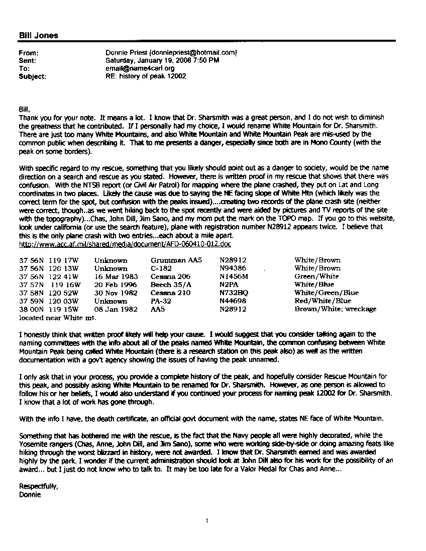 STATEMENT OF DONNIE PRIEST RE SAFETY ASPECTS OF FORMALLY NAMING SHARSMITH PEAK